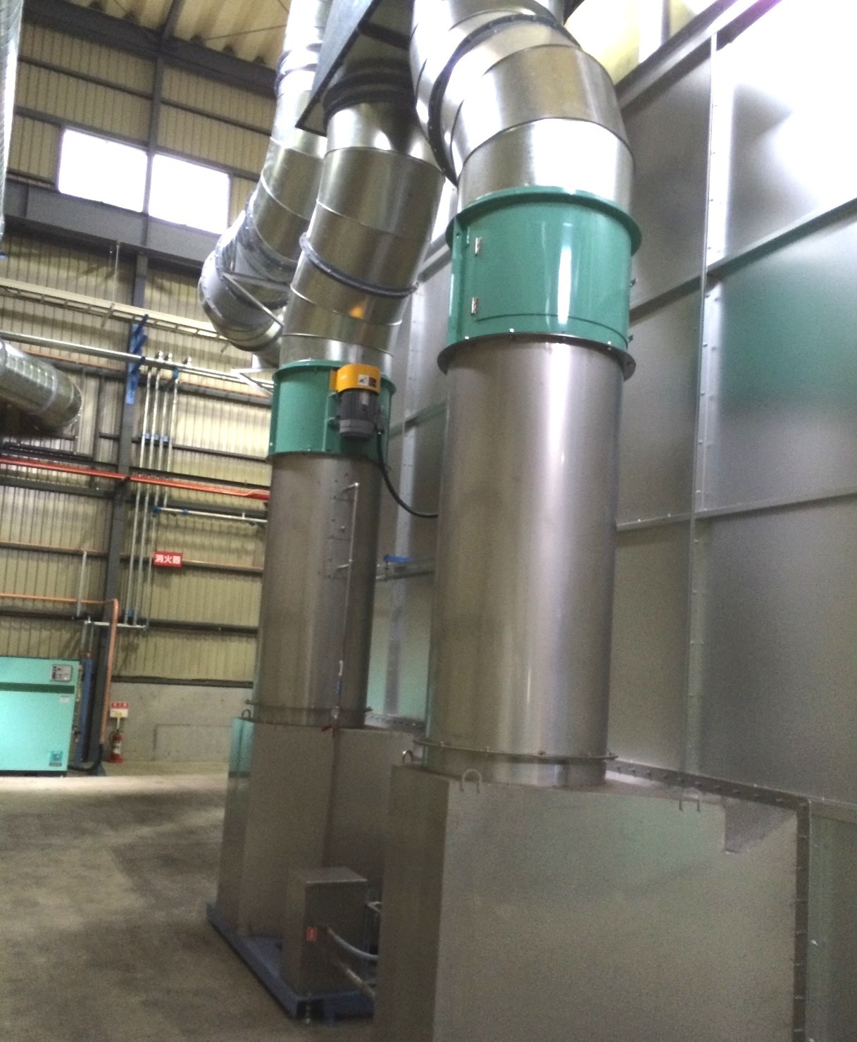 右写真は、広い工場内各部に排気吸入ダクトを設け、センターダクトに排気を集中させ、そこで排気処理を行っています。除じんと一部脱臭処理をしています。